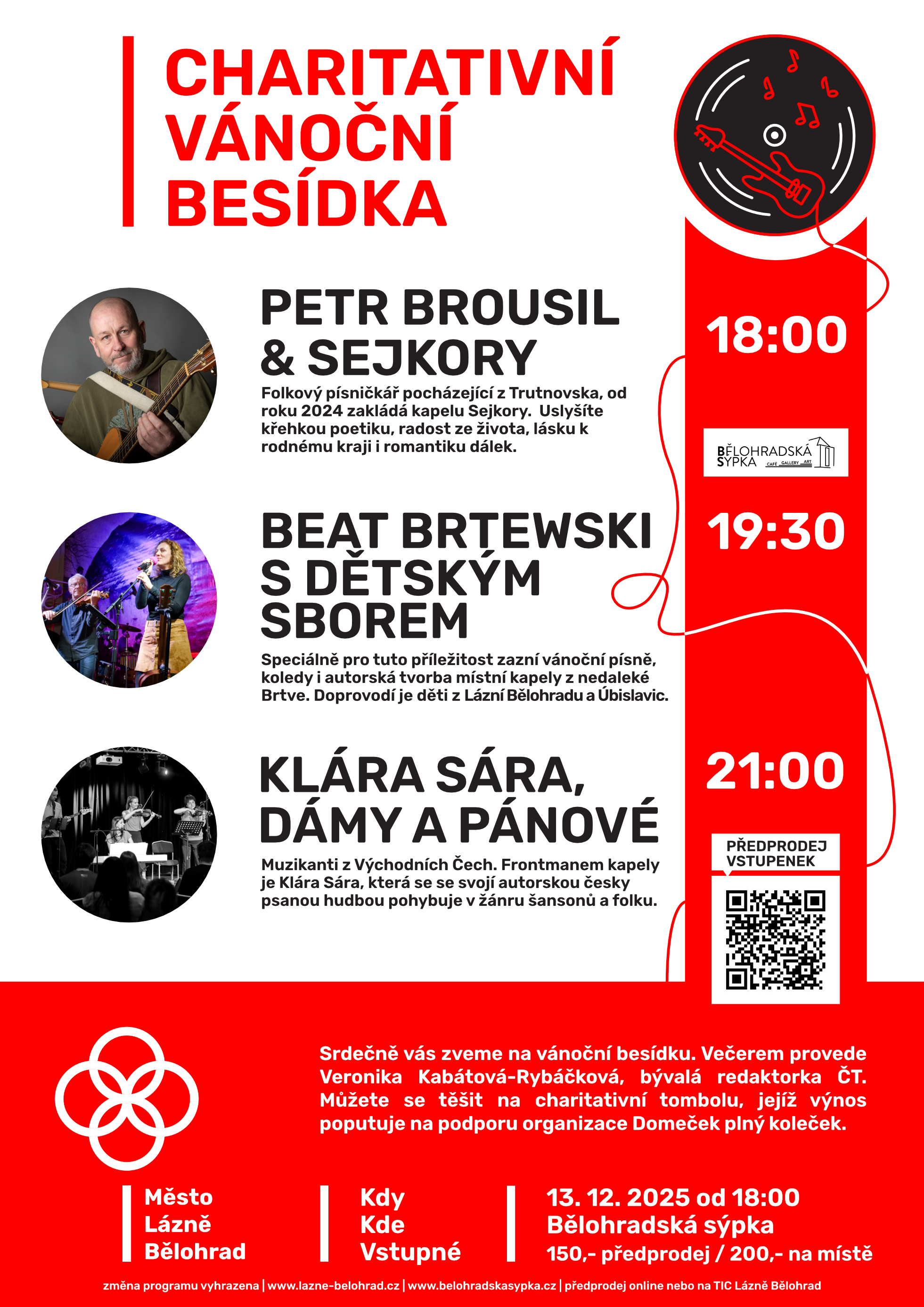 Speciálně pro tuto příležitost zazní vánoční písně, koledy i autorská tvorba místní kapely z nedaleké Brtve. Doprovodí je děti z Lázní Bělohradu a Úbislavic.